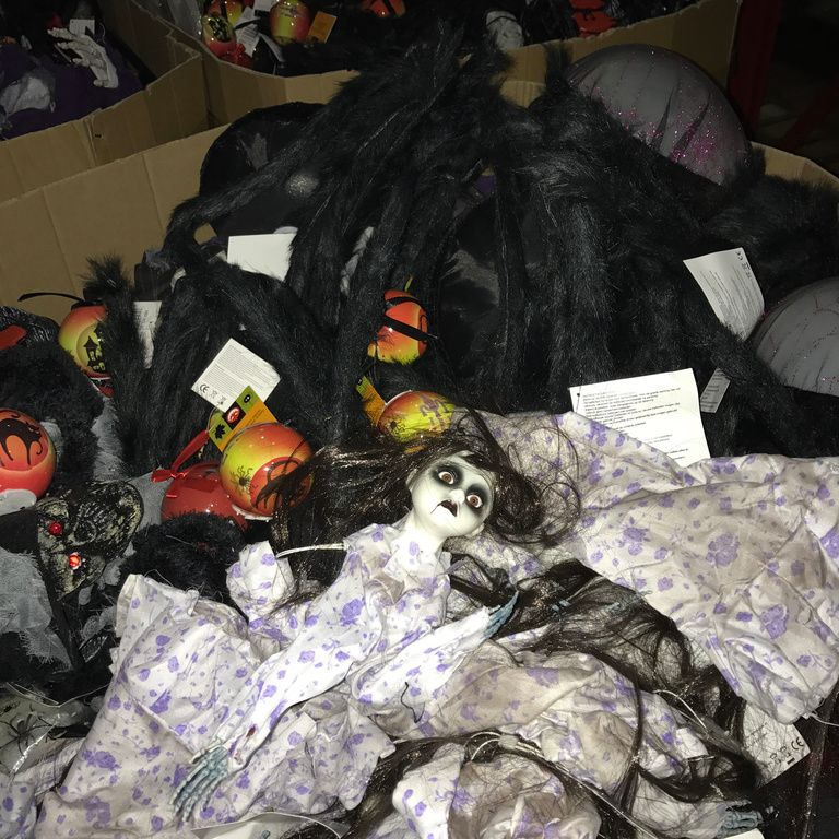 9x Palletboxen with mix Halloween items. Pallet size: 120 x 80 x 100 Cm.